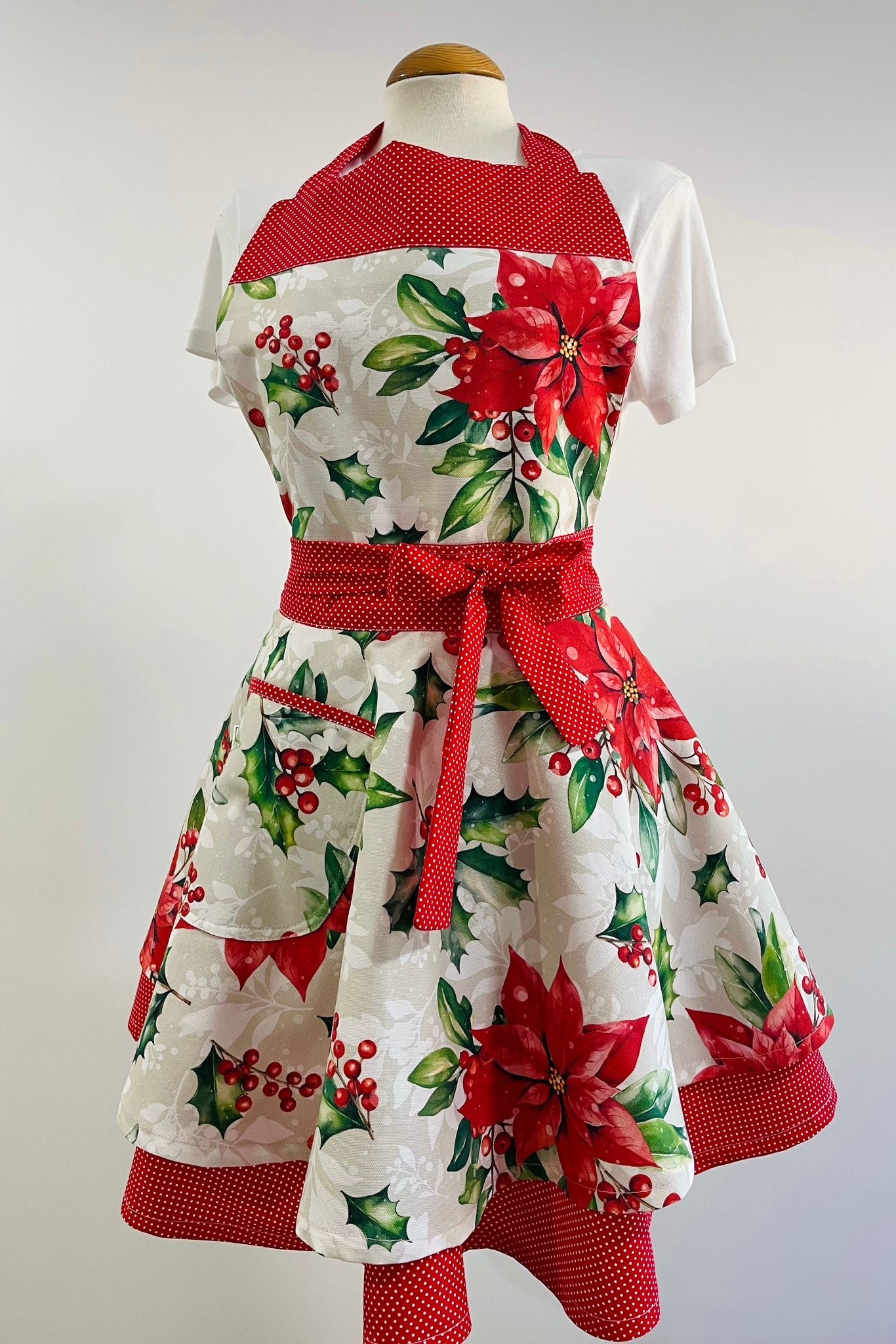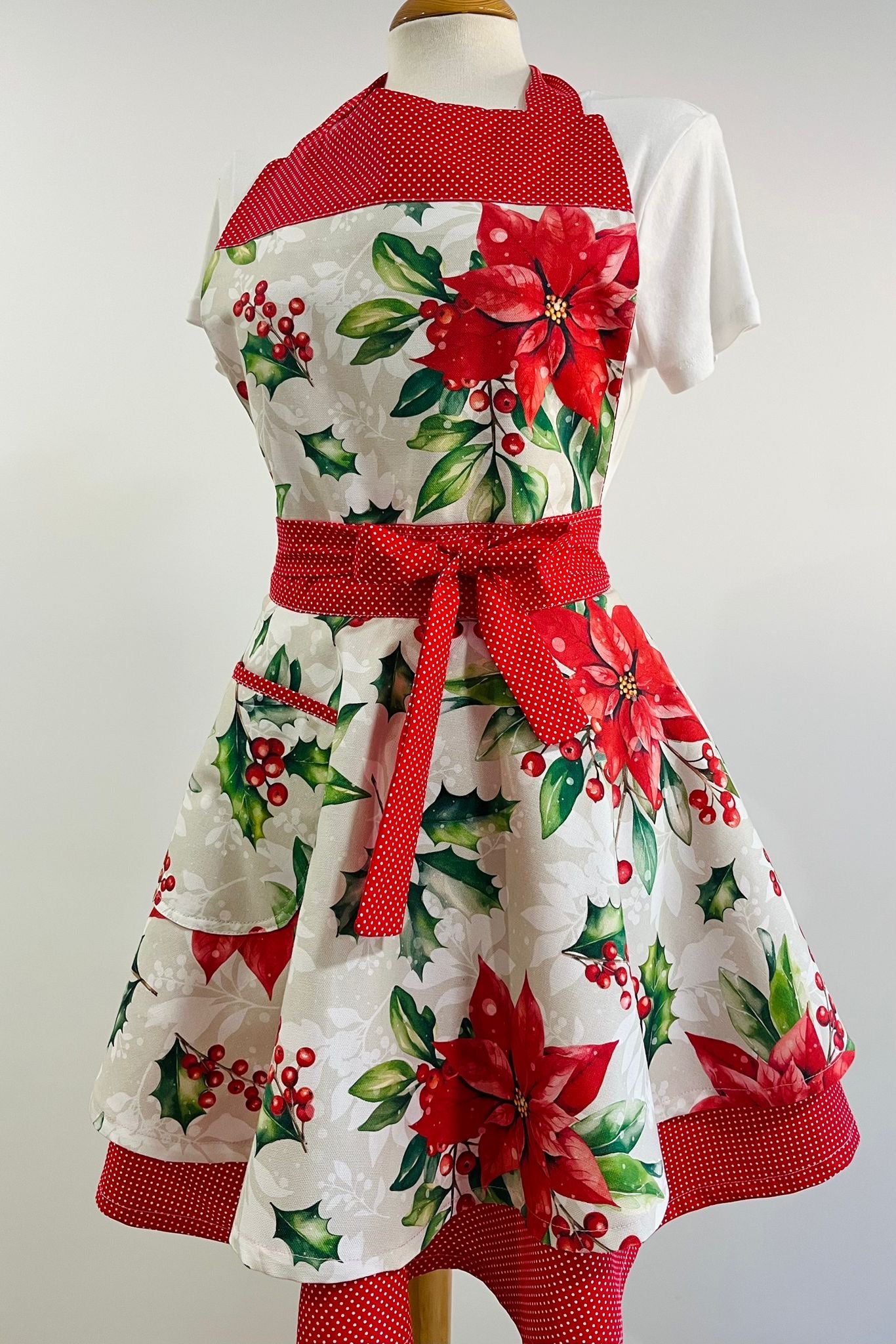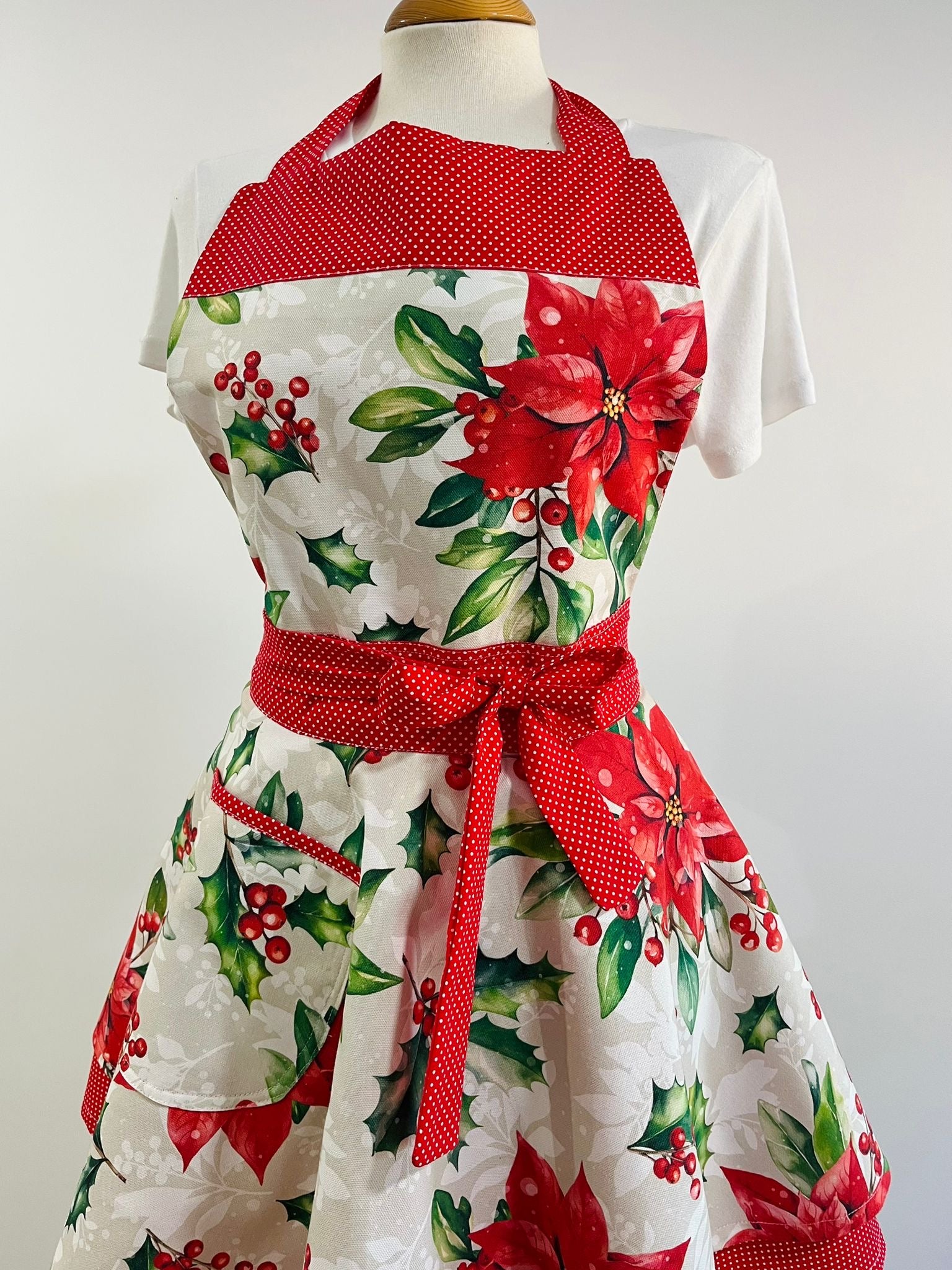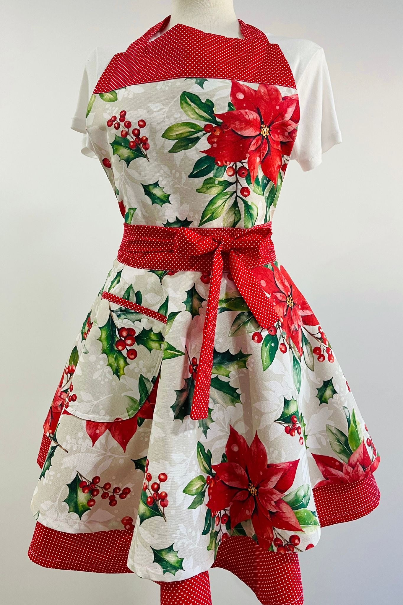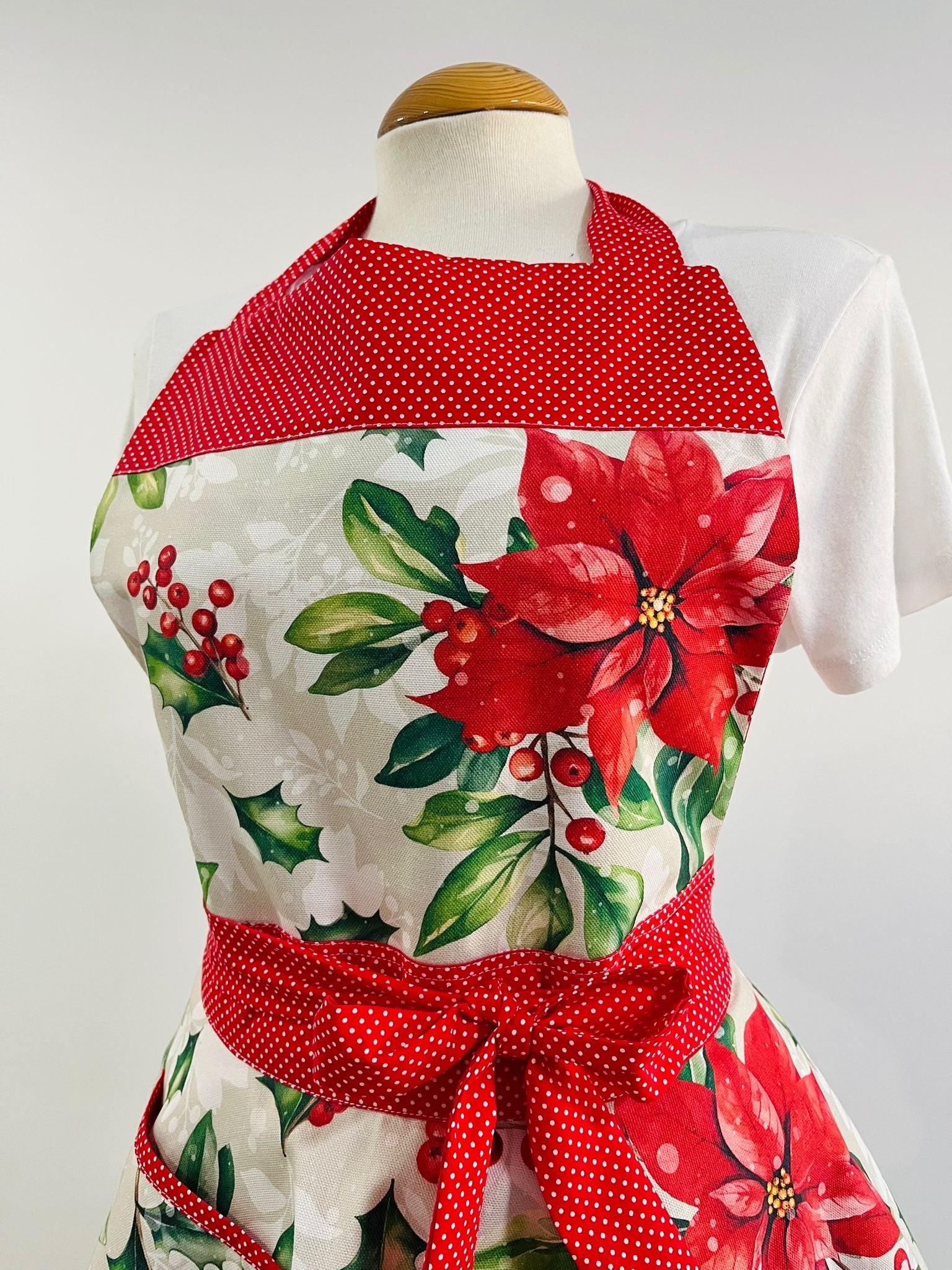 Añade un toque de encanto navideño a tu cocina con este precioso delantal retro de doble falda, confeccionado artesanalmente con tejidos de Half Panamá y algodón de alta calidad.