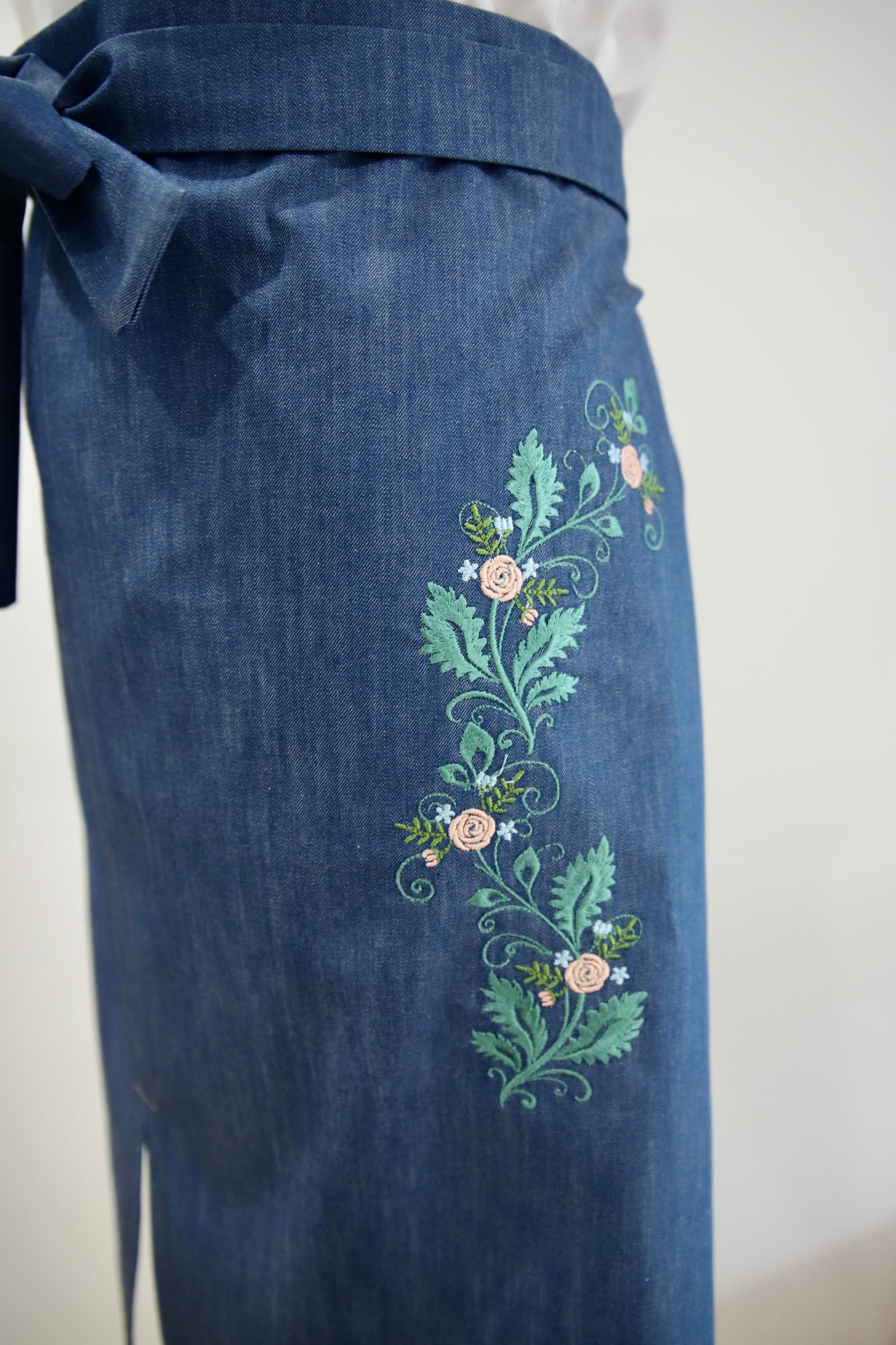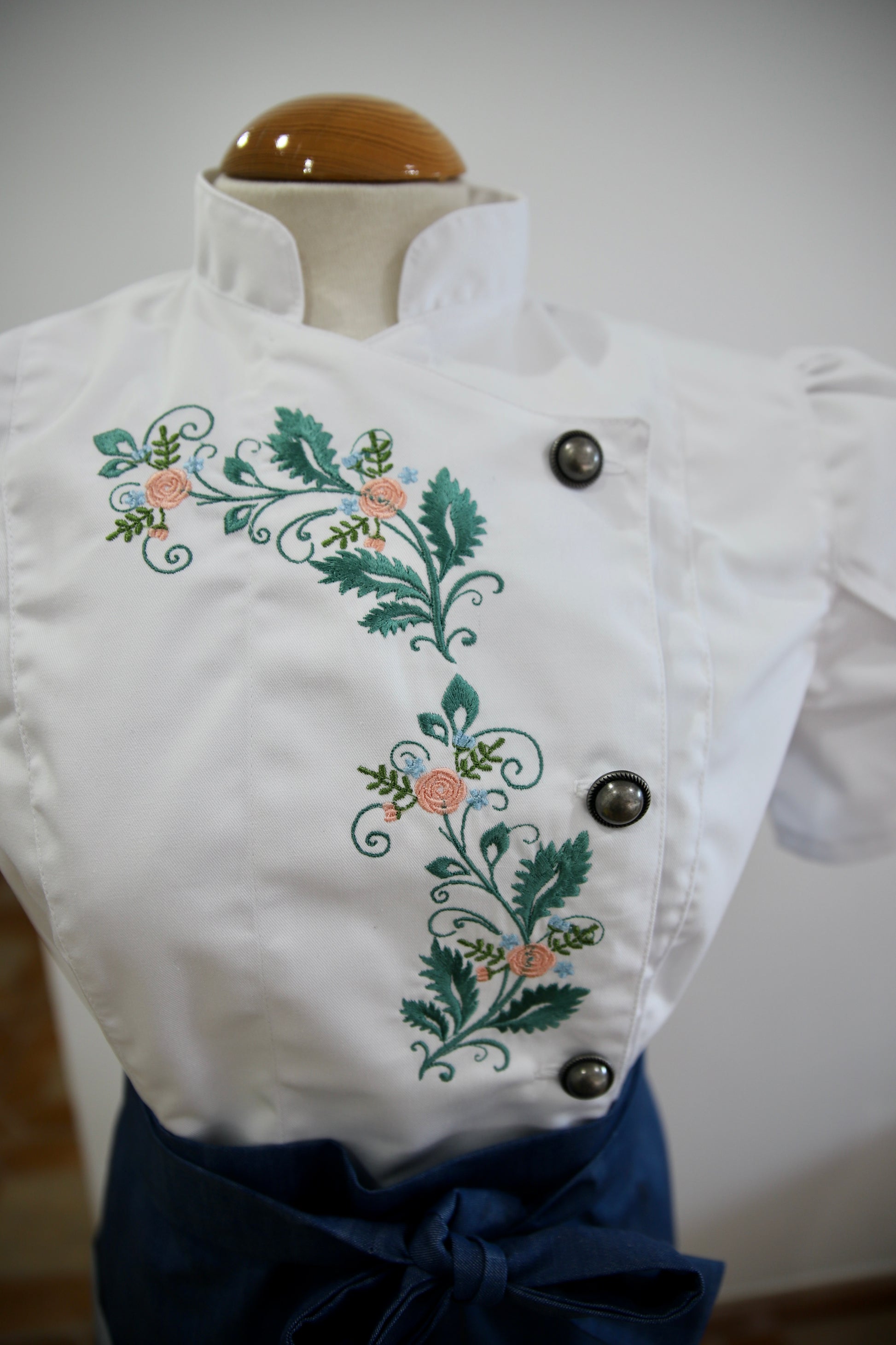Cada prenda está cuidadosamente confeccionada y adornada con un bordado floral exclusivo que se repite en la chaqueta y el delantal, creando una armonía perfecta entre diseño y detalle.